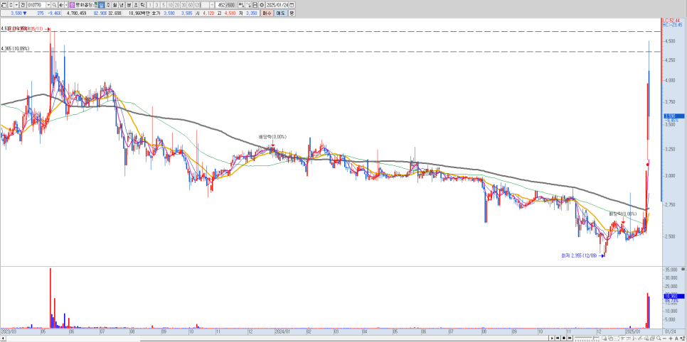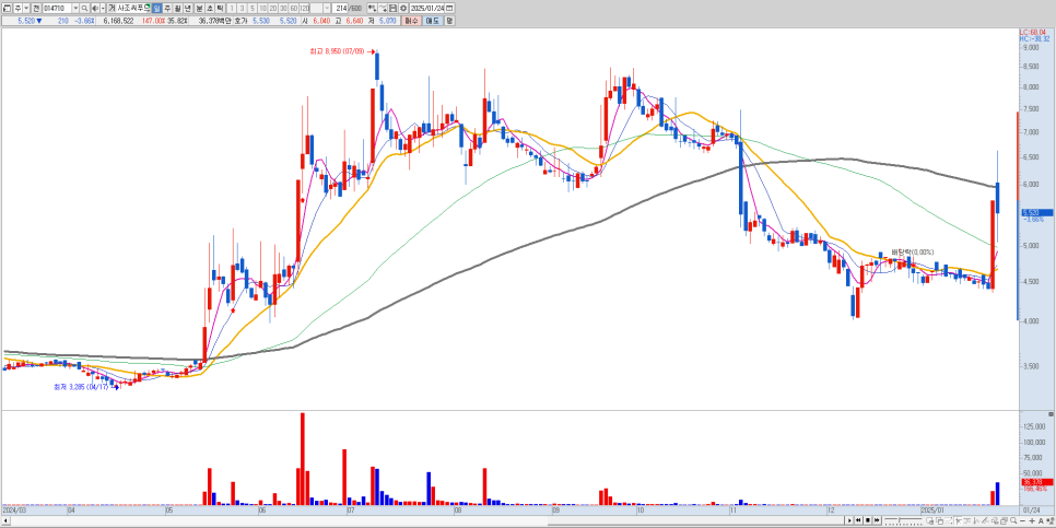 김문수 관련주 중 가장 큰 주목을 받은 평화홀딩스는 시가총액 525억 원 규모로, 최근 주가가 2,500원에서 4,500원까지 급등하는 놀라운 상승세를 보여주었습니다. 특히 45.4%의 적정한 유통비율을 보유하고 있어 시장 수급에서도 안정적인 모습을 보여주고 있습니다.